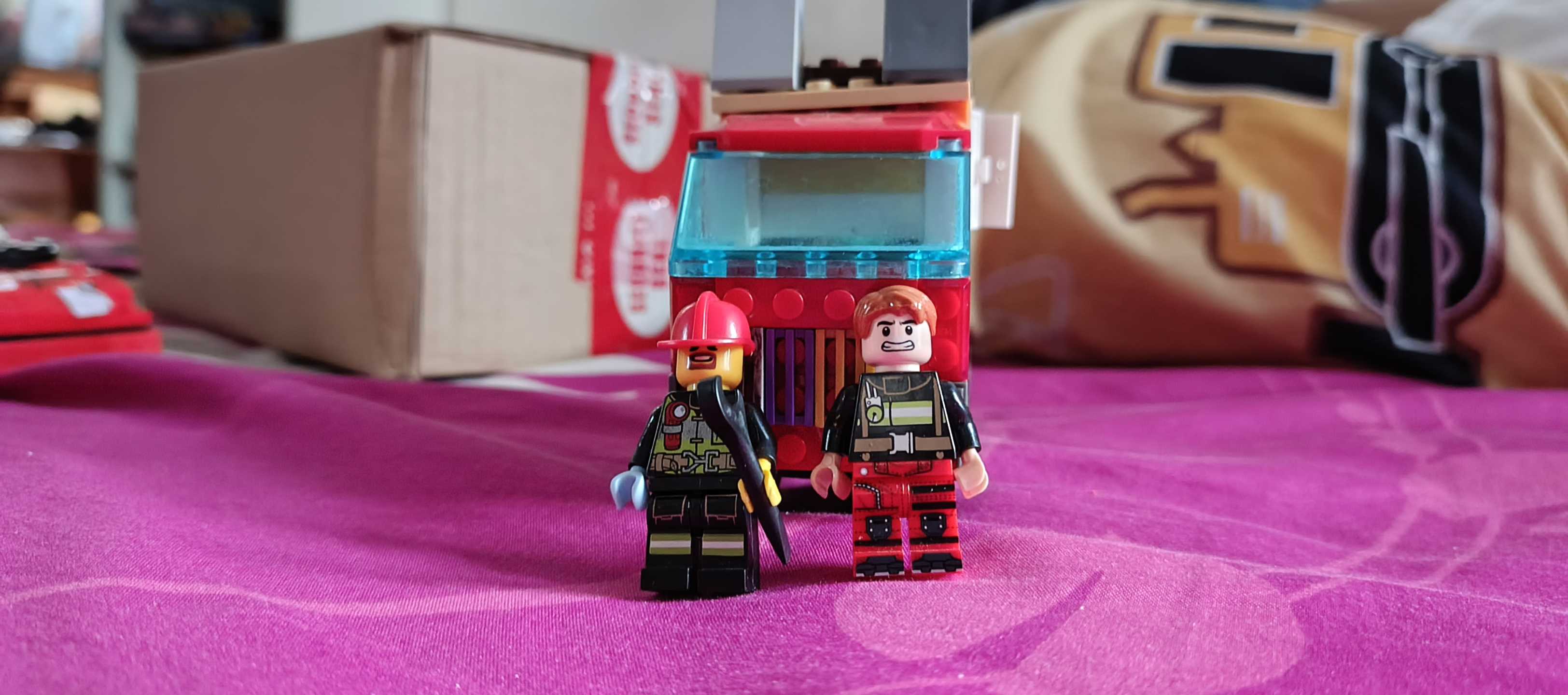Two brave firefighters standing proudly in front of their mega fire truck — ready to save the city, rescue cats, and maybe also rescue Dad's snacks. Built with maximum hero energy and extra siren power.