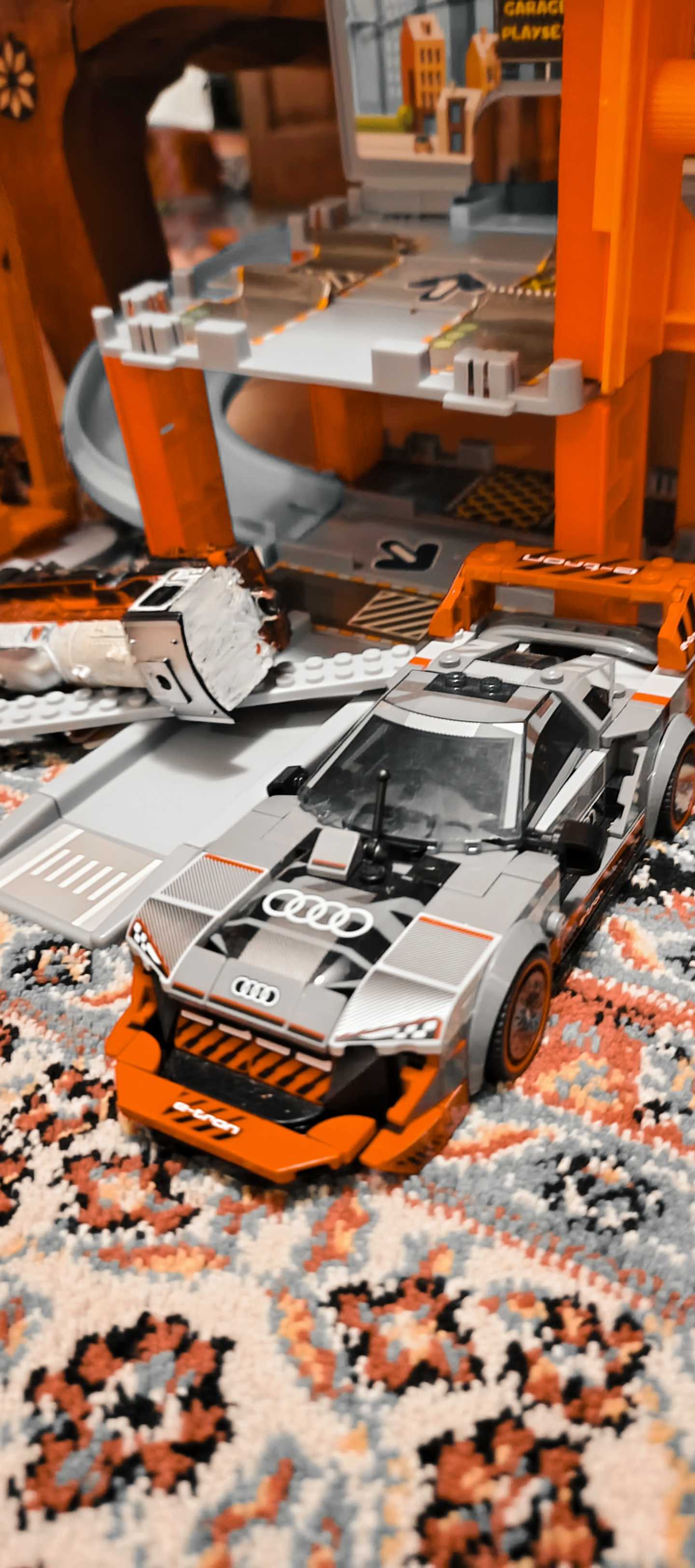 A super-fast Audi race car parked inside Kiano's turbo garage. This car can zoom so fast it almost outruns bedtime. Engine: 100% LEGO, 0% brakes, 200% vroom-vroom power.